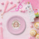 the design features a cute pink birthday party photo template with a pretty pink princess tiara crown, with pink confetti glitter sparkles sparkling, a birthday party disposable paper plate, a sweet adorable whimsical fun party, for a dessert cake dinner paper plate, a girly girl feminine kids toddler, a creative photo picture template, a simple minimalist modern typography, a cute princess birthday party supplies