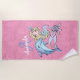 Custom mermaid pink beach or swimming pool towel for a girl. Monogrammed with her initial and name. It features a cute blonde mermaid, a dolphin, and a turtle with stars and other sea creatures with a pink and gold mermaid scale background.