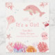 Ahoy It's a girl! celebrate upcoming baby shower with our cute modern under the see watercolor whimsical ocean dolphin, jellyfish, starfish, coral, crab, stingray fish, and bubble in beige colour. You can personalise your own text and colour via "personalise this design".