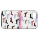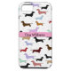 A great iPhone case that is perfect for any dog lover. It features a white background with little weenie dogs all over it. A pink stripe runs through the centre. You customise the text in the centre.