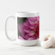 Macro photograph of pink dahlia on 15oz while mug.