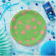 Bright pink daisy pattern with a swirling black doodle bug trail on a bright green background