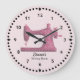 This sewing themed wall clock is printed with a vintage sewing machine graphic image done in a rose pink damask pattern with digitally "stitched" outline effect. Accented with black numerals on a pale pink background. Personalize the text in the easy Zazzle editor for your favorite sewing or quilting enthusiast. Great wall decor gift for any sewing or crafting space. Available in your choice of round or square styles.