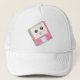 Cute, pink floppy disc or diskette with a cartoon face on it.