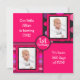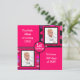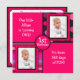 This square invitation for baby's first birthday is modern and contemporary! Design features a four square design on the front. There are two hot pink squares with text in white fun font. The text can all be customised to suit your needs. The other two squares have a spot for baby's then and now photo's. One is on a dark grey background with polka dots in shades of pink and purple. The other is on a background of pink and purple stripes. In the centre is a hot pink circle with black trim. In the middle of the circle is a place for the birthday number, whether it's 1st or 2nd, etc. The reverse side of the invitation has a black background with hot pink trim, designed to look like torn, crumpled paper, same as the photo areas on the front. There is a white centre rectangular area with text in alternating hot pink and black font. The text can all be customised with your own wording.
