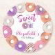 This cute "It's Sweet To Be One" doughnut illustration themed round coaster is perfect for a baby girl's first birthday party. It features pink and purple hand-drawn doughnuts on a white background and text that you can customise with your own details. The template is personalised in the listing editor.
