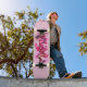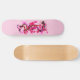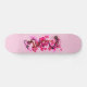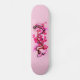 a decorative design of a pink coloured dragon, lizard or serpent with pink blossoms growing from a tree branch on a lightly pink coloured skateboard.