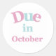 A cute maternity design on T-shirts, buttons, mugs, tote bags, and other items, great for the pregnant mum to be and also the dad to be with pink text design that reads "Due in October"!
