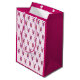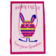 This fun Easter gift bag is fully customisable, just type in the boxes to change the greeting and the name or other text. The default in deep pink script is "HAPPY EASTER" and "Love from Grandma". The background is pale pink, and the cheeky easter egg shaped bunny has stripes and patterns in pink, blue and yellow.