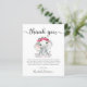 Cute budget-friendly baby girl shower or sprinkle thank you card with "thank you" in a stylish soft grey script with swashes and a watercolor of baby elephant adorned in pink florals. Easily personalise your thank you message in simple grey topography or leave blank for a handwritten note.