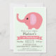 Baby pink elephant with polka dot ear, jungle, zoo animals, safari theme girl birthday party invitation. Personalise this cute, retro feel invite with your child's name. Cute, simple, plain design. Perfect for baby's first, 1st, birthday, toddler, young children, or older kids. Colours include pastel pink and brown..