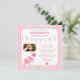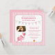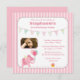 This super cute 5.25x5.25 girls birthday party invite has a pink stripe background with an elephant holding some balloons in the middle. There is also a cupcake and a banner with a place for you to add your own photograph. You can easily customise the birthday party information in the middle. Some elements are Graphics by Lilly Bimble at MyGrafico