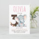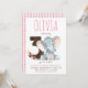 This invite features a pink elephant for a third birthday party. Back of invite has a pink gingham pattern. Personalise the invite with your details and you have the options to purchase printed invitations or a digital download.
