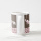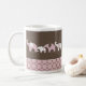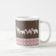 Pink elephants in many combinations line this mug with circles in brown at the bottom.