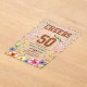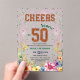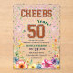 A modern design featuring a dark gold glitter number 50 with pink and emerald glitter and colorful flowers on the bottom. Customize the details for a chic Birthday Celebration.