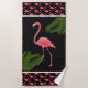 This beach towel is shown in a tropical pink flamingo print design on a black background colour.