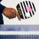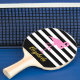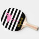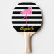 A pink flamingo appears on this ping pong paddle that has black and white stripes. You can customise your ping pong paddle with your name at the bottom in faux (not foil) gold script.
