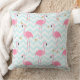 This fun and pretty throw pillow has a pattern of pink flamingo birds and faux gold circle dots. The images are placed on a light blue and white chevron striped background. Perfect for a patio or sun room, with a colourful tropical feel. Both sides of the pillow have the same pattern.