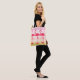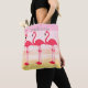 Create a custom pink flamingo tote bag add your own name or text to personalise it on shabby chic stripes in shades of pink and yellow all over print.
