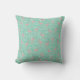 There's a pink flamingo pillow chillin' on a turquoise thing. That flamingo pillow, all pink and stuff, is just hangin' out against the turquoise background.