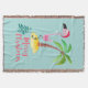 Throw blanket with a cute illustration of a pink flamingo in a red santa hat. Standing beside a green palm tree on a mound of yellow sand. A fancy swirly christmas tree design is placed beside the text Merry Christmas. Written in the colour pink in a fancy handwritten font. Pastel green background.