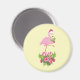 A magnet with a tropical themed Christmas flamingo wearing a pink santa hat. Underneath its feet is a candy cane bouquet with pretty tropical flowers and pink berries. A sprig of holly on its chest.