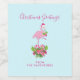 A bottle label with a tropical themed Christmas flamingo wearing a pink santa hat. Underneath its feet is a candy cane bouquet with pretty tropical flowers and pink berries. A sprig of holly on its chest.