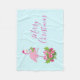 A blanket with a tropical themed Christmas flamingo wearing a pink santa hat. Underneath its feet is a candy cane bouquet with pretty tropical flowers and pink berries. A sprig of holly on its chest.