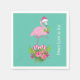 Paper napkins with a tropical themed Christmas flamingo wearing a pink santa hat. Underneath its feet is a candy cane bouquet with pretty tropical flowers and pink berries. A sprig of holly on its chest.