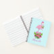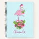 A spiral notebook with a tropical themed Christmas flamingo wearing a pink santa hat. Underneath its feet is a candy cane bouquet with pretty tropical flowers and pink berries. A sprig of holly on its chest.