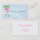 Business cards with an illustration of a momma and baby pink flamingo standing on a bed of floral succulent flowers with green palm trees swaying in the back.