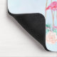 A personalised mousepad with a name and initial separated by a thin blue line divider. Designed with an illustration of a momma and baby pink flamingo standing on a bed of floral succulent flowers with green palm trees swaying in the back. Tropical and pretty. The background is a summery light blue watercolor with hints of purple.