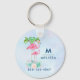 Keychain personalised with a name, initial and phone number. Designed with an illustration of a momma and baby pink flamingo standing on a bed of floral succulent flowers with green palm trees swaying in the back. Tropical and pretty. The background is a summery light blue watercolor with hints of purple.