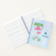 A spiral notebook with an illustration of a momma and baby pink flamingo standing on a bed of floral succulent flowers with green palm trees swaying in the back. Tropical and pretty. The background is a summery light blue watercolor with hints of purple. Personalise with a monogram initial and name.