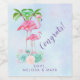 Congrats wine bottle label with an illustration of a momma and baby pink flamingo standing on a bed of floral succulent flowers with green palm trees swaying in the back. Tropical and pretty. The background is a summery light blue watercolor with hints of purple.