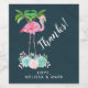 Thank you wine bottle label with an illustration of a pink flamingo standing on a bed of floral succulent flowers with green palm trees swaying in the back. Tropical and pretty. The background is dark blue.