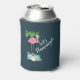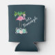 A can cooler with an illustration of a pink flamingo standing on a bed of floral succulent flowers with green palm trees swaying in the back. Tropical and pretty. The background is dark blue. Text says: Let's Flamingle.
