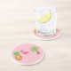 Sandstone coaster features an original marker illustration of a pink flamingo, palm tree, and pineapple, printed on a pink background.