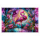 A luminous pink flamingo stands gracefully beneath a glowing moon, surrounded by blooming florals and flowing botanical lines in a dreamy stained glass mosaic style. Jewel-toned blues, teals, violets, and radiant magentas blend into a celestial watercolor backdrop, while golden outlines create an elegant art nouveau feel. The design evokes whimsical boho glamour with a touch of tropical enchantment, balancing bold color with soft, romantic energy. AI generated artwork.