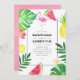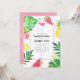 Bachelorette weekend invitation with itinerary featuring exotic tropical foliage and flowers, fresh fruits and a flamingo.