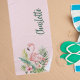 A feminine blush pink background decorated with a pink flamingo and tropical flowers and foliage. Personalise and add a name