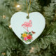 Ornament with a cute digital illustration featuring a pink flamingo with one leg raised. Standing on a bouquet of tropical hibiscus flowers and leaves. A pretty butterfly is hovering around the flowers.