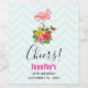 Party bottle labels with a cute digital illustration featuring a pink flamingo with one leg raised. Standing on a bouquet of tropical hibiscus flowers and leaves. A pretty butterfly is hovering around the flowers. A light green and white chevron pattern in the background.