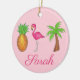 Ornament features an original marker illustration of a pineapple, palm tree, and tropical pink flamingo bird.