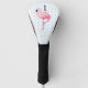 Cute lady's golf club cover done in a sky blue on white polka dot pattern. Fun graphics of a pink fuzzy flamingo, decorates the middle of the cover. Personalise the black number to read what you want. Great gift idea. Chose either driver cover or putter cover.