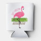 Keep your canned beverages cool with this fun can cooler. The front and back design has a pink flamingo, on one leg, standing in front of a row of palm trees.