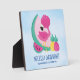 Photo plaque with your name and business. A cute illustration of a pink flamingo with some watermelons and pineapples. Pink and green colour scheme. Summery and tropical.