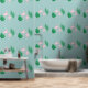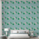 This custom wallpaper features a tropical pink flamingo design on a dusty teal coloured background. An image of two pink flamingos and vibrant green palm leaves is tiled across the wallpaper. The image has a foil design that gives it a metallic appearance.