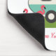 A mousepad featuring an illustration of a retro trailer home with turquoise stripe and awning and three pink plastic flamingos in the yard. Customisable text says "Home Is Where You Put Your Flamingos!"