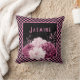 Stylish pillow design features pink and black chequerboard background with large floral bouquet and customisable text on black centre square